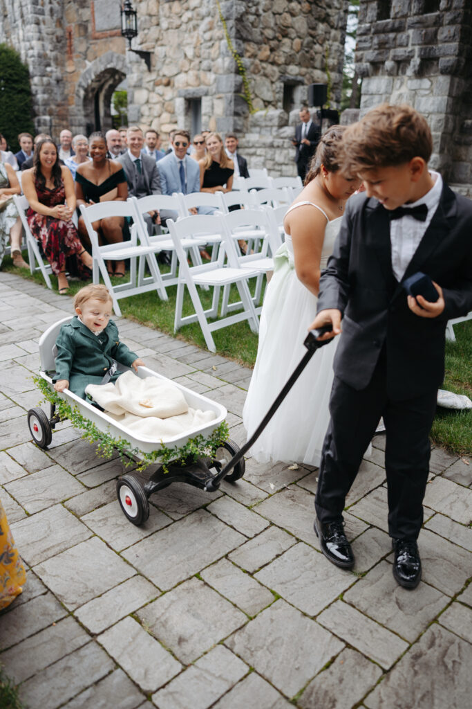 It was the youngest ring bearer getting pulled down the aisle in a wagon with a potato chip on his blanket to keep him happy.